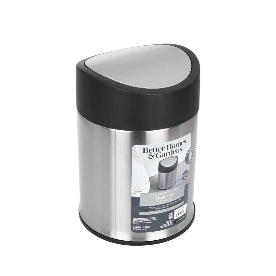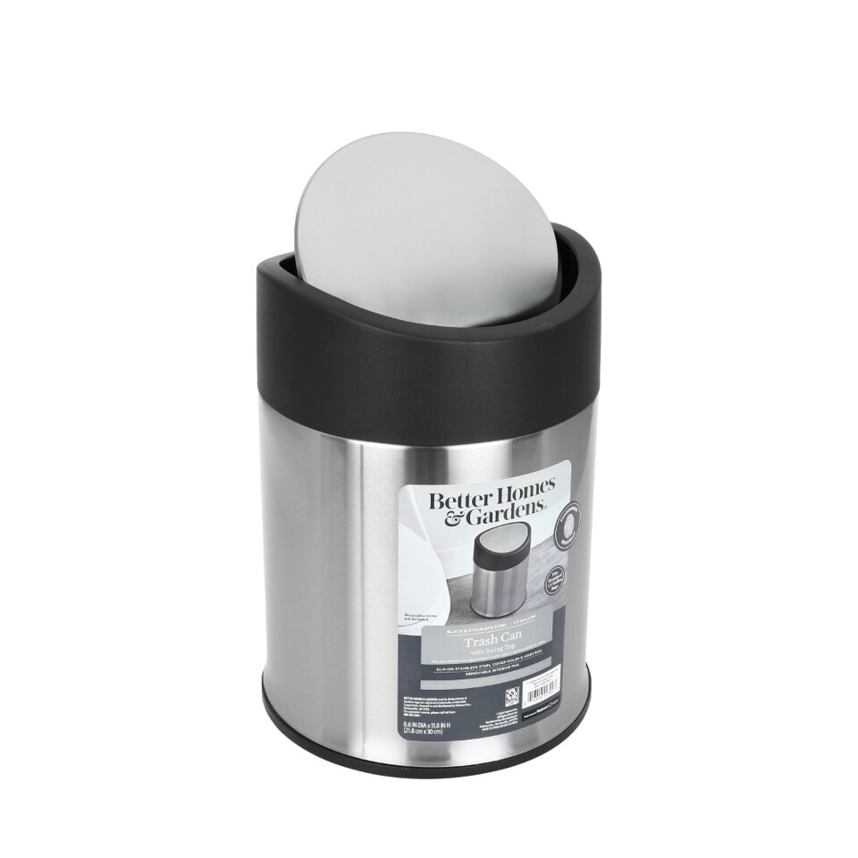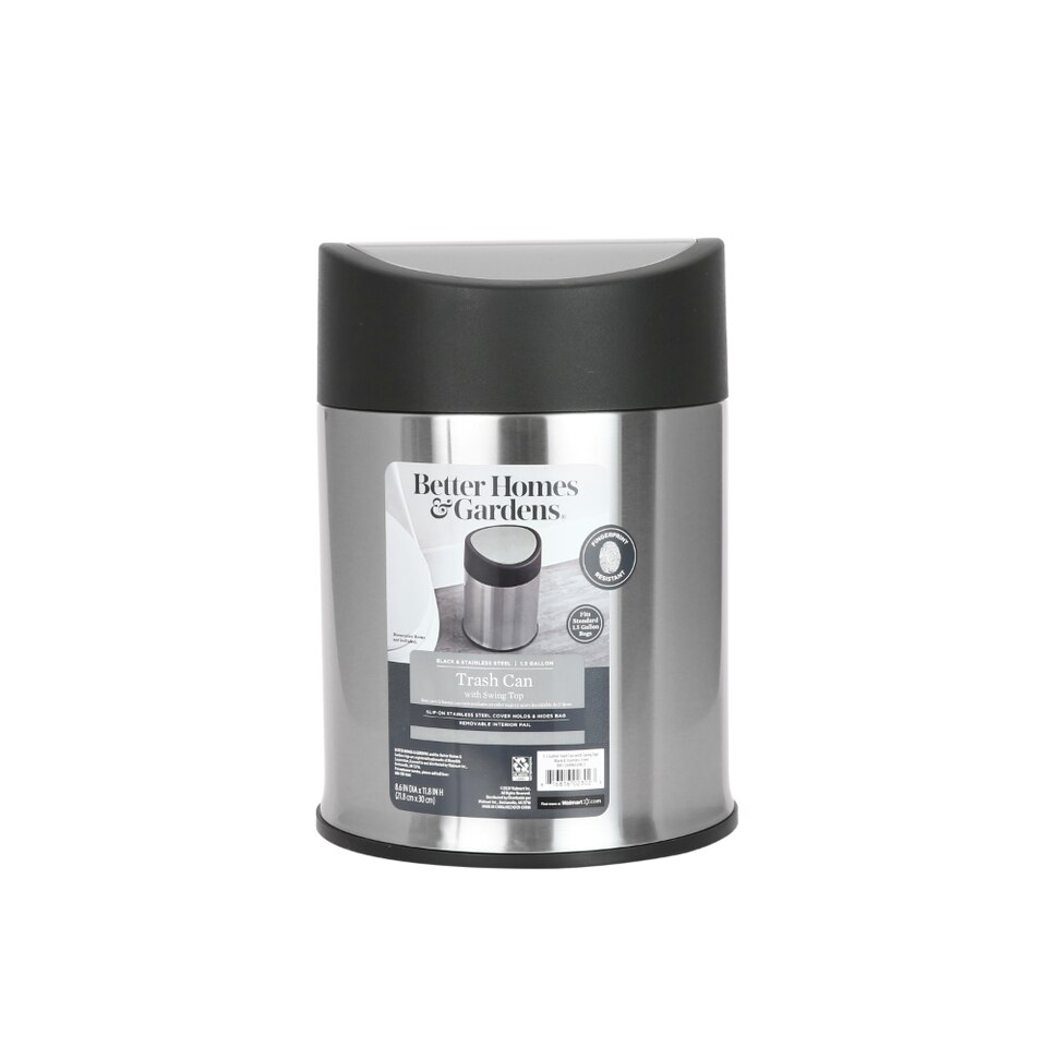 Simplify your waste management needs with a Better Homes & Gardens 1.3 Gallon Stainless Steel Swing Top Garbage Can. Its shiny chrome-like exterior blends in nicely with all types of home decor. Use this Trash Can in a nursery, small kitchen, office, bathroom, dorm room, and more. This stainless-steel trashcan features a sturdy swing-top lid for easy opening and closing. All Better Homes & Gardens stainless steel trash cans are fingerprint resistant to remain clean and smudge-free. Line this can with trash bags to make emptying it quick and easy. You can rely on the Better Homes & Gardens 1.3 Gallon Stainless Steel Swing Top Trash Can as a fixture in your bathroom or around the home.