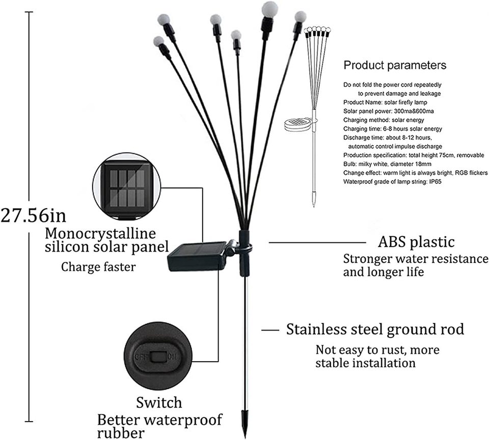 - Easy to Install, No Wiring Required:No cables or plugs needed, just plant the solar lights in your garden and flip the switch to enjoy the most beautiful solar decorative lights in the world.