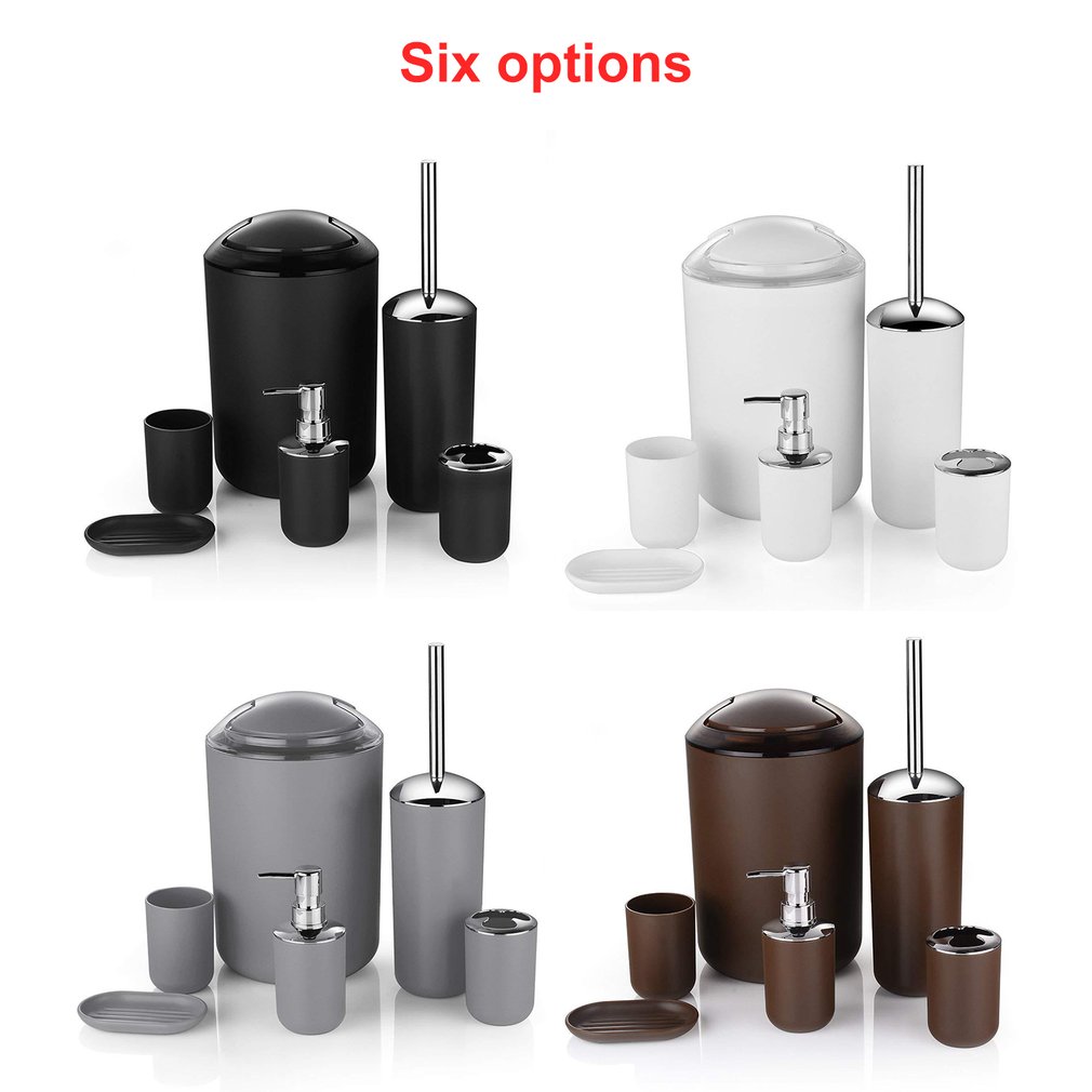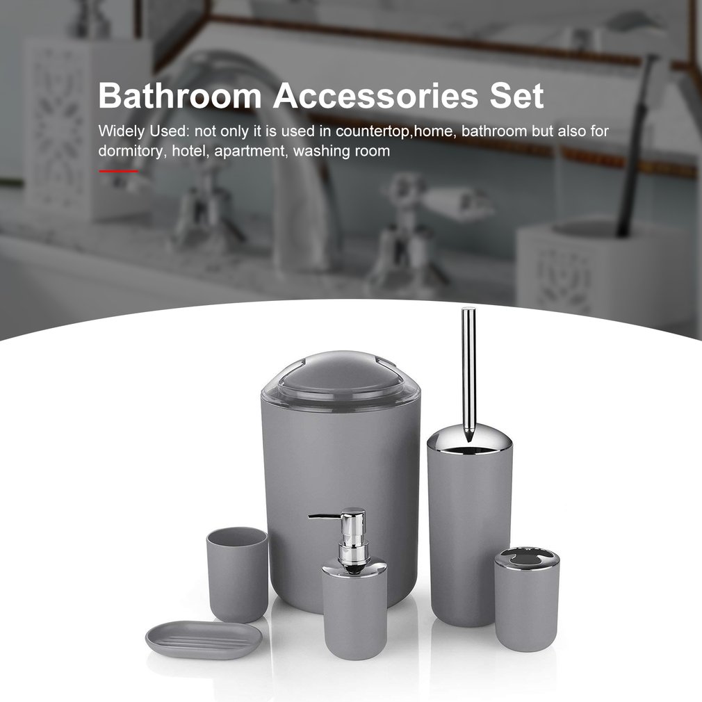 1.This is a set of 6 bathroom essentials including toothbrush holder, toothbrush cup, soap dispenser, soap dish, toilet brush holder, trash can, to meet different needs.