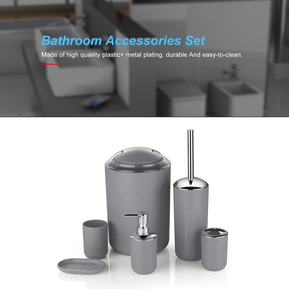 1.Set of 6 bathroom essentials including toothbrush holder, toothbrush cup, soap dispenser, soap dish, toilet brush holder, trash can, to meet different needs.