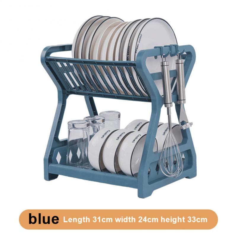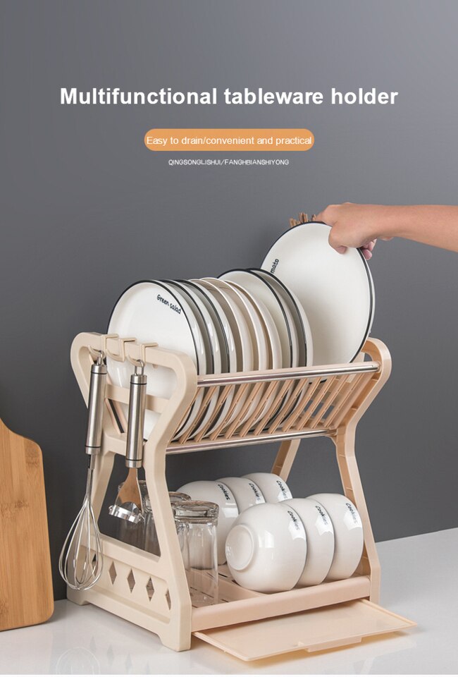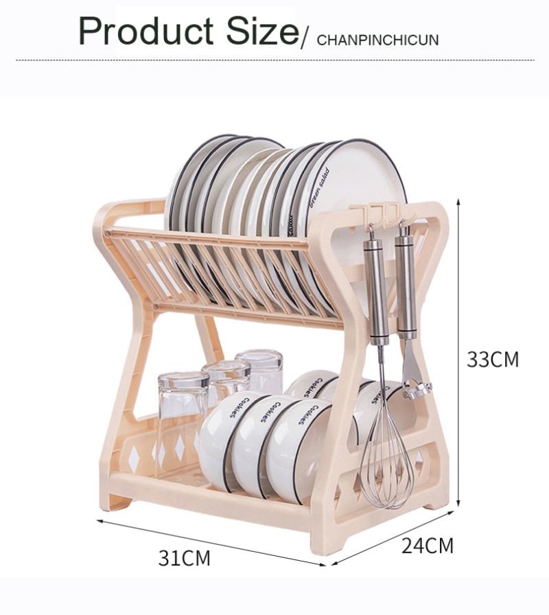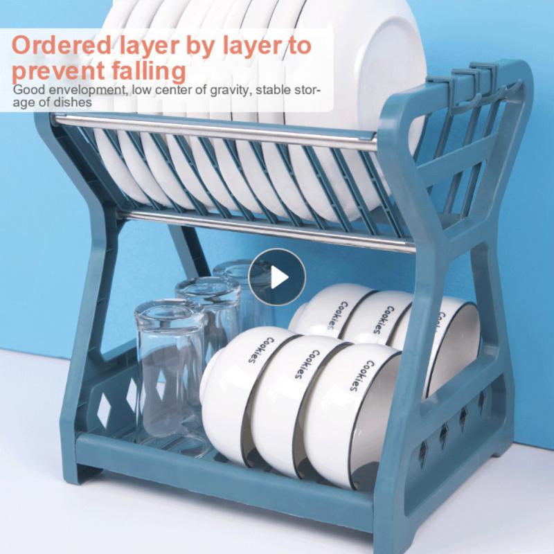 The product is a multifunctional bowl and chopstick holder, which can easily drain the water marks on the dishes, and is used to place dishes, bowls and chopsticks, etc., which is convenient and practical. In terms of design, layer by layer to prevent falling, good envelopment, low center of gravity, and stable storage of dishes. The product is designed with two layers. The upper layer can be used for the drained dishes, the lower layer can be used for the freshly washed dishes for draining water, and the bottom is also placed on a tray to store the dripping during the draining process. Water stains can keep the kitchen clean without water stains flowing out.