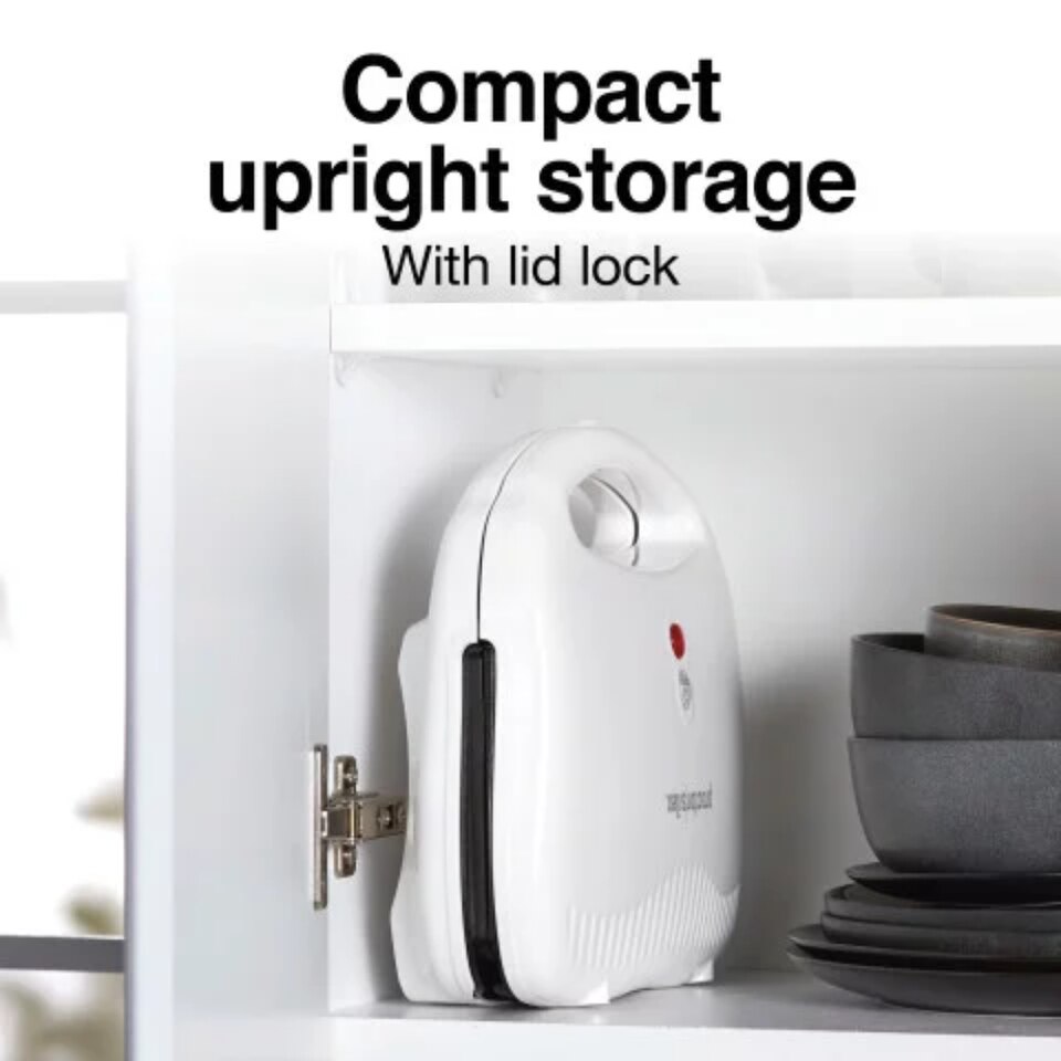 - COMPACT, UPRIGHT STORAGE: A lid lock keeps the sandwich maker shut between uses and makes it easy to store either flat or upright. Save space in your cabinets and have the sandwich maker close at hand whenever you want a quick snack or meal.