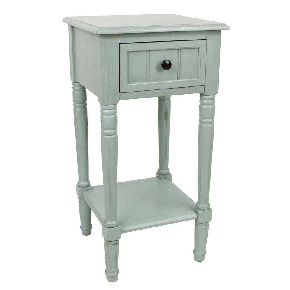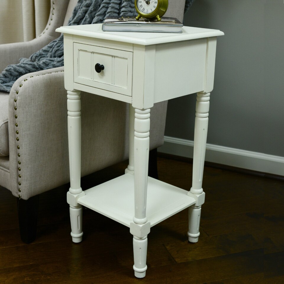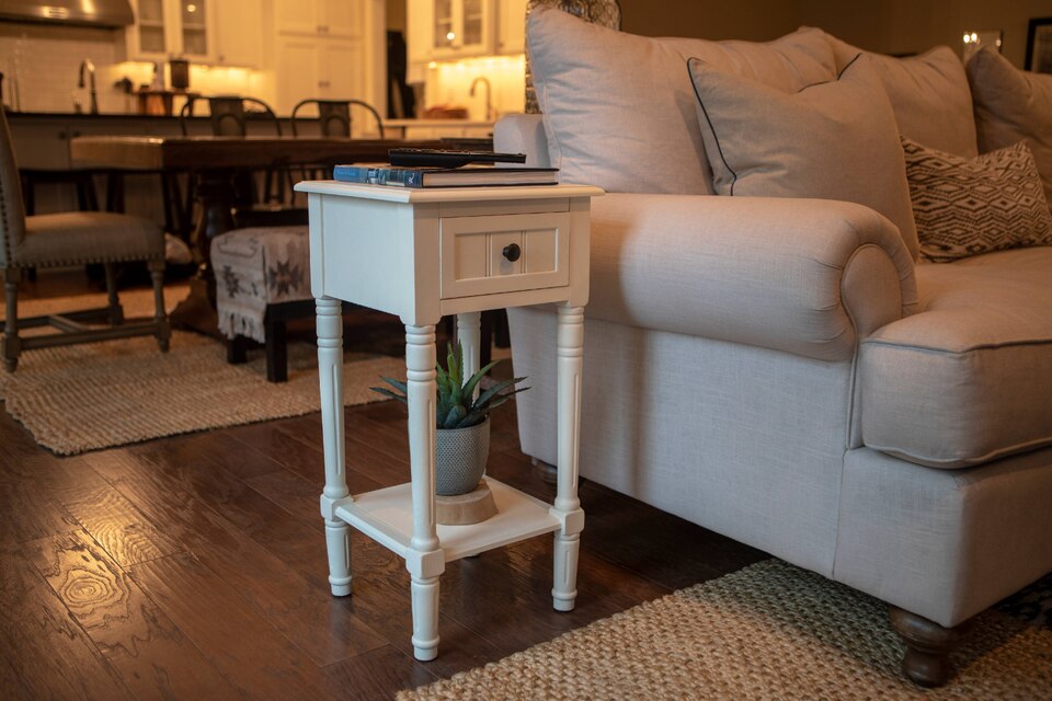 The quintessential side table, the Simplify One Drawer Accent Table is a delightful blend of timeless design and functionality. Classic turned legs and traditional details create the feel of a family heirloom, as if this table has been apart of your family for years! The traditional details are complimented by the clean, modern lines creating a transitional look that harmoniously blends into almost any style of decor. A single storage drawer allows you to keep clutter out of sight, but easily accessible. The lower shelf is ideal for displaying a basket, books or photos. Available in a variety of finishes, ensuring you can find a side table that best suites your needs. The opportunities to put this multipurpose accent table to use are endless! Place one next to your bed to use as a night stand, in the entryway to catch keys and greet guests or next to the sofa topped with a lamp and vase of cheerful blooms. The Simplify accent table is compact and making it ideal for small spaces as well as larger ones. Constructed of wood solids and MDF.